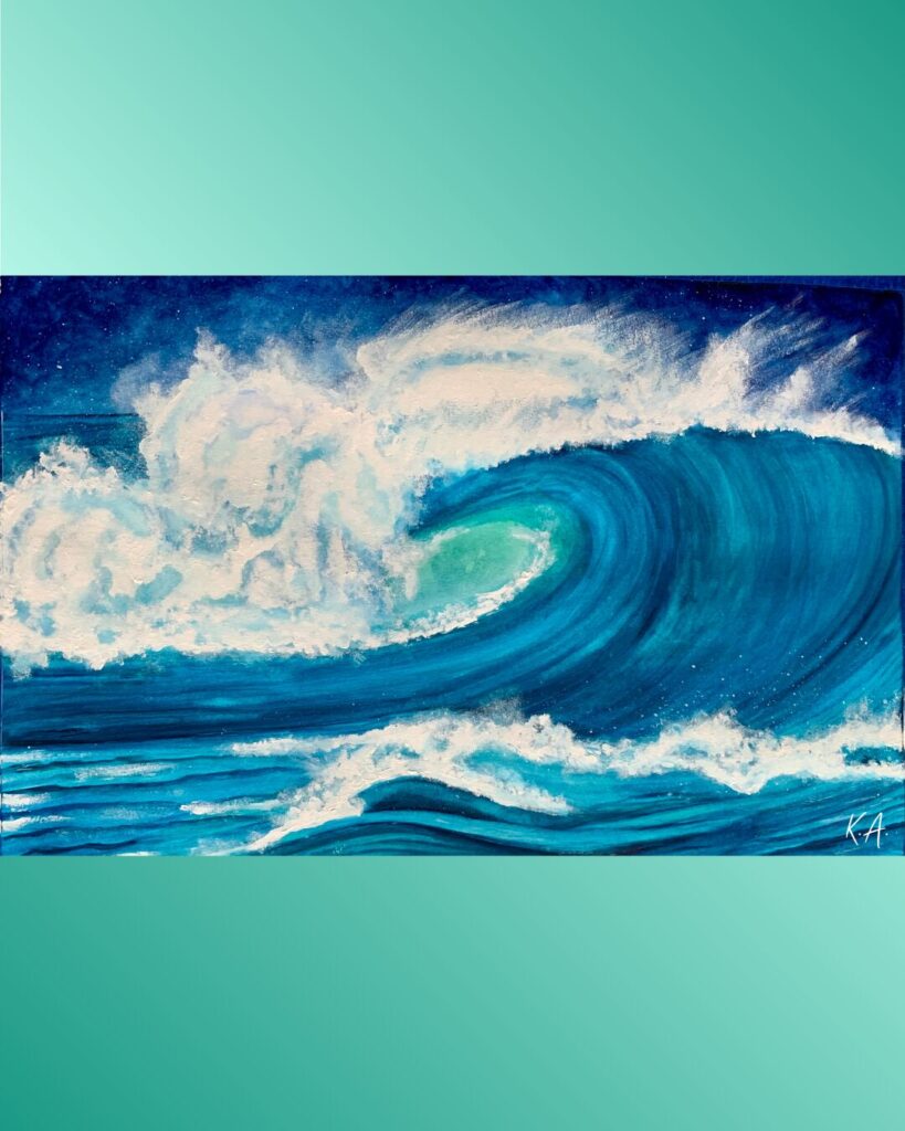 Handmade watercolor or acrylic art with abstract waves, coastal colors, or sea creatures.